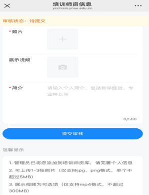 5.按照页面内容上传照片、视频和个人简介后,点击“提交审核”,待管理员审核通过后,老师们的信息会在首页“培训师资”中展示出来。