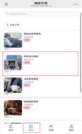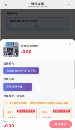 3、进入平台后,点击下方“课程”菜单,点击“导师培训课程”进入课程详情页面,勾选拟报考模块课程,上传所报模块相应资质,经材料审核通过后方能购买。