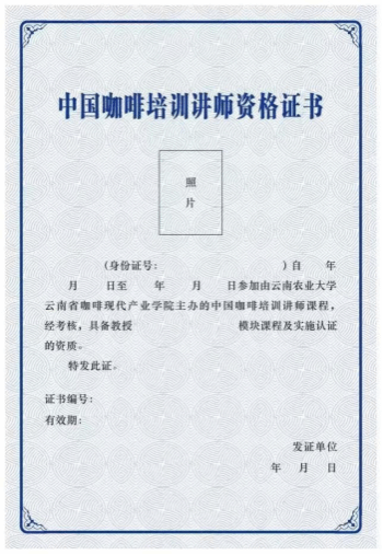 由云南农业大学颁发的培训讲师资格证书,为全国首个由高校颁发的咖啡培训讲师资格证书,在业内具有较强影响力。(证书式样如下图)