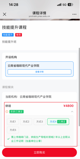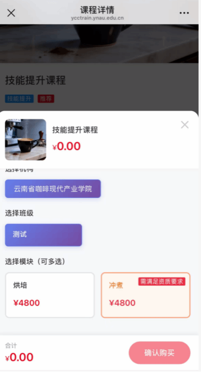 4、在弹窗中选择机构、班级、模块信息,点击确认购买按钮。(注:本期培训只开设冲煮、浓缩、烘焙、运营四个模块的培训班,选择培训机构时请选择“云南乐咖食品有限公司”)